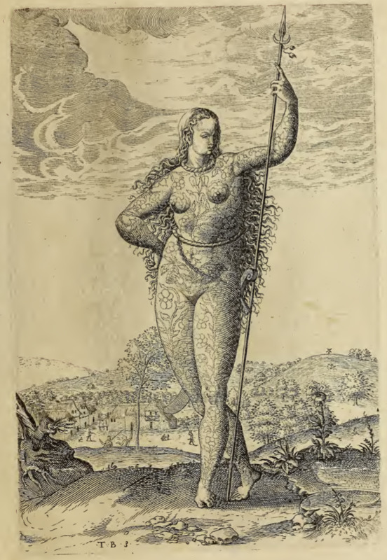 A young Indigenous woman is shown from the front. She carries a spear in her left hand. Her hair is long, she wears a twisted cord around her neck, and a sword with a curved blade hangs another cord around her waist. She is nude, and her body is covered in painted designs. The Picts were an Indigenous group who lived in Britain long before the author’s time. Images of Picts were included in this book so that readers could compare their customs to those of the Indigenous people living in Virginia.