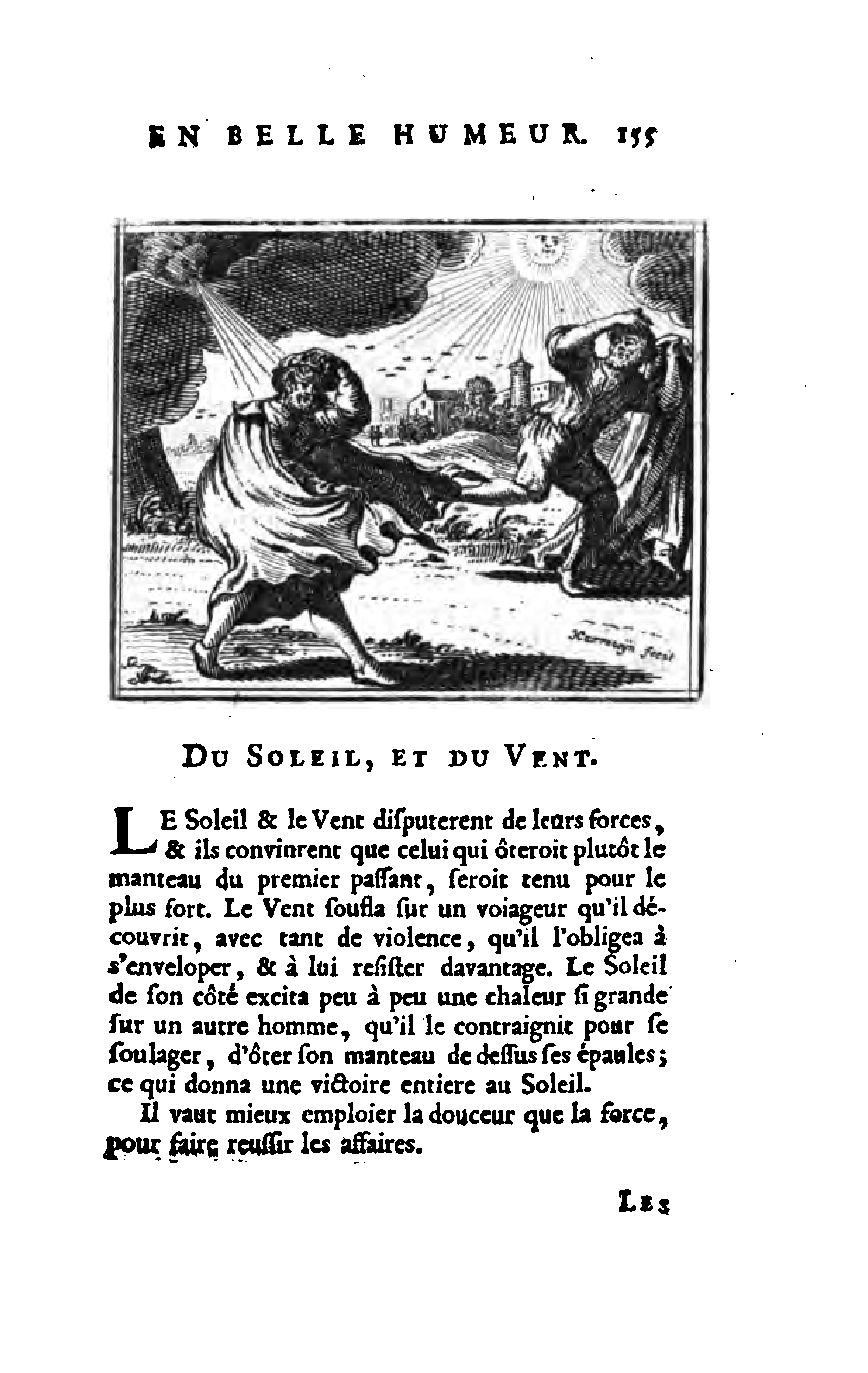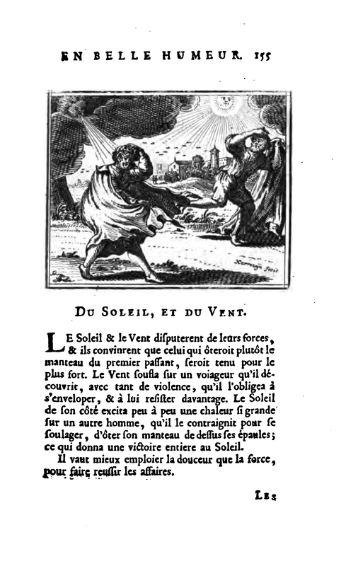 The wind and the sun were disputing over who was stronger. They saw a traveler and the sun said: I know how we can decide our dispute. Whichever of us can cause that traveler to take off his cloak shall be regarded as the stronger. So the sun went behind a cloud, and the wind began to blow as hard as it could upon the traveler, but the harder he blew the tighter the traveler wrapped his cloak round him, till at las the wind had to give up. Then the sun came out and shone upon the traveler, who soon found it too hot to walk with his cloak on.