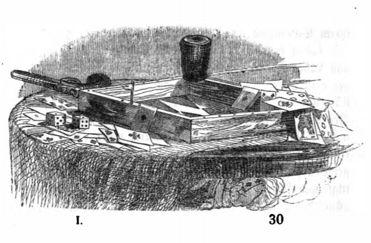 Here we see a games table with cards and dice spread over it. A cup, likely representing alcohol and a gun are also on the table. In this chapter Gulliver tells the King about diplomacy, religion, the justice system, the arts, the financial system, and the nobility, then debated these issues with the king. This image comes when Gulliver is discussing gambling in England. The same image appears in the 1839 Krabbe edition.