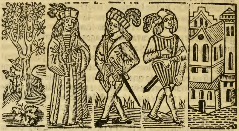 Soon after Celestina leaves Calisto’s house, Calisto grows impatient and tells Sempronio to visit Celestina and urge her to fulfill her duties with expediency. Sempronio expresses concern about leaving Calisto alone in his state of despondency, so Pármeno comes to keep him company and Sempronio departs (as depicted in this illustration). While Sempronio is away, they discuss Calisto’s heartache, and Pármeno attempts to inform Calisto of Celestina’s treacherous ways. All three figures are depicted with hats, while Pármeno and Sempronio both have swords mounted on their belts.[The figures in this illustration are used in multiple other illustrations throughout this edition.]