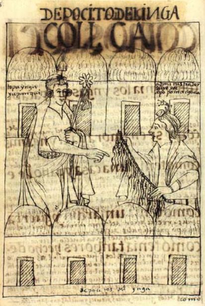 This chapter is dedicated to discussing the Inca and his life. This image depicts the Inca in front of his many collca [storehouses]. There are four storehouses illustrated at top of the image behind the Inca and four at the bottom in front of the Inca. The Inca had storehouses in many regions over the empire and they were mostly filled with food items such as maize, sweet potatoes, coca, and chile peppers. The Inca is depicted wearing his traditional regalia and holding a scepter in his left hand and pointing with his right as he speaks to an administrator who supervises the collca. The administrator is depicted holding a quipu in both of his hands. The caption to the left of the Inca’s head identifies him as Topa Inca Yupanqui. The caption to the right of the administrator’s head identifies him as administrador, suyoyoc, apo poma chaua [administrator, Apo Poma Chaua].