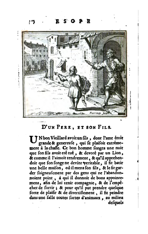 A good old man had a son, whose soul was great and generous, who was extremely fond of hunting. This good man dreamed one night that his son had been killed, and devoured by a Lion, and as he loved him dearly, and feared that his dream would not become true, he had a beautiful house built, where he led his son, and had him carefully guarded by people who did not abandon him, to whom he gave good wages, in order to keep him company, and to prevent him from forging; And so that he could take some pleasure and entertainment, he had all the strong animals hung in a room, in the middle of which he had a lion represented.