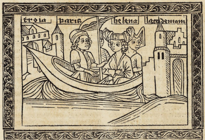 This engraving depicts prince Paris of Troy leaving the shores of Lacedaemon on a ship that carries queen Helen, wife of king Menelaus. Boccaccio explains that Paris had fallen in love with Helen while he was a guest in king Menelaus’ home. It is debated whether Helen’s feelings towards Paris were mutual and she willingly went with him, or if he had taken her by force. This image depicts Paris sitting on the left side of the ship (his name is engraved above his head), and Helen sitting on the right side (her name is also engraved above her head). Lacedaemon is illustrated on the right side of the engraving, while the city of Troy is on the left side. The ship is pointing towards Troy as that is their destination. Paris and Helen going to Troy is the cause of one of the greatest wars of all time: The Trojan War.