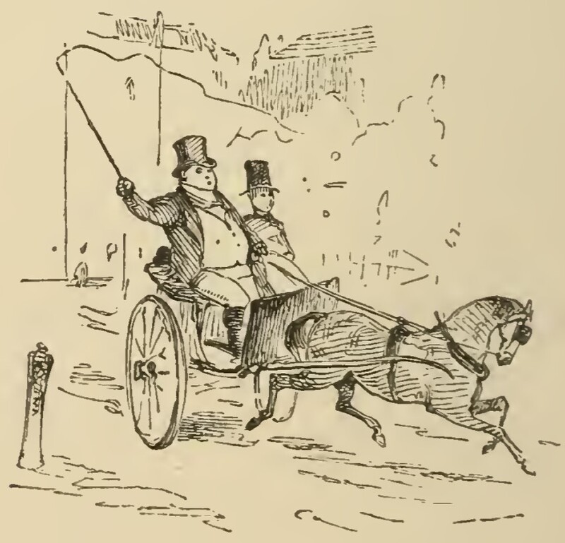 Joseph Sedley is seated in a small, open, two-wheeled carriage pulled by a single horse. He holds the reins in his left hand with the whip raised high in his right as the buggy passes a post. At his side is seated another, unspecified, male figure in a tall hat. In the background can be seen the outside of some trees and two buildings. Too nervous to go see Becky Sharp in the drawing-room, he has decided to see a performance of Forty Thieves instead.