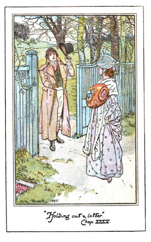 Here we see Mr. Darcy delivering his letter to Elizabeth when she came to the north of England with her aunt and uncle on vacation. Mr. Darcy stands outside the open gate, tipping his top hat to Elizabeth and holding out his letter. Elizabeth stands on the inside of the gate, holding a muff in front of her. In this letter, Mr. Darcy outlines the reality of the character and his relationship with Mr. Wickham. Mr. Wickham was a militia officer stationed in the town near Longbourn. He was very charismatic and Elizabeth’s sister, Lydia, ran away with him and got married, much to the distress of the rest of the Bennet family. Mr. Darcy disapproved of Mr. Wickham, as Wickham was Mr. Darcy's father’s godson, and Wickham tried to marry Darcy’s sister, Georgiana, in order to obtain her wealth. Wickham also inherited some money from Mr. Darcy’s father with the intention that he join the clergy, but he did not follow through with his clerical studies. In this letter he also explained why he split up Jane and Mr. Bingham, because he did not realize their mutual love. Darcy explained to Elizabeth that he thought Jane unworthy of Bingley and persuaded him to leave Netherfield. In his letter, he apologized for this misjudgment. The letter was intended to address Elizabeth’s accusations regarding his pride, and Elizabeth’s prejudices against him. The letter marks a shift in Mr. Darcy’s character and the beginning of the real love between Elizabeth and Darcy. This scene occurs in chapter 35 as noted underneath the title of this image. The characters are shown in the traditional regency style, with Mr. Darcy wearing waistcoat, tailcoat, an overcoat, and knickers that stopped at the knee. Elizabeth wears the regency style dress with an empire waist. Her hair is worn tied up, as was tradition for women after their coming out before the queen, signaling her entrance into society. She wears a bonnet, a popular fashion of this period to protect her from the sun. Bonnets were especially popular because in this period a common pastime for women was going out on walks. Elizabeth has a shawl wrapped around her shoulders. The regency period dated to the early nineteenth century (1811-1820) when George, Prince of Wales, later George IV (r. 1820-1830), reigned as regent for his mentally ill father, King George III (r. 1760-1820). The regency period is associated with the rise of neoclassicism in art and fashion.