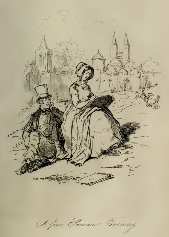 Amelia Osborne sits on a stool on the beach, drawing in her sketchbook. William Dobbin sits on the sand next to her, watching her with an expression of bliss. Further down the shore, a boy is riding a kicking donkey whose lead rope is held by a girl. In the background is a castle and tower on a cliff. Below the illustration is printed in cursive its title, A fine Summer Evening.