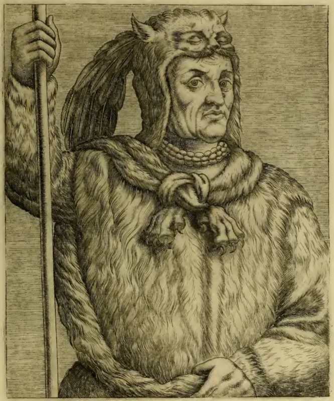 Paraousti Satouriona (also called Saturiwa, or Satiroa according to Thevet – Paraousti may be a title rather than the name of the man) is shown in portrait from the waist up. His torso is angled slightly to his left and he gazes at the viewer. He wears an animal skin cap with the ears, eyes and nose of the animal attached and a large feathered tassel hanging from the back. He wears a multi-strand beaded necklace, a thick tunic of fur, and a fur cape with the paws of the originating animal still attached and tied at his neck. He holds a spear in his right hand. Paraousti Satouriona was a notable chief who led the Timucua group of peoples in Florida when the French were undertaking colonial projects in the region. Not much is known about him outside of his dealings with the French colonists, with whom he maintained largely amiable relations.