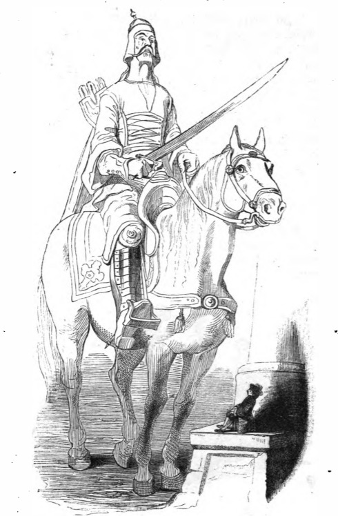 In this image we see Gulliver sitting on a base of a column, looking up at a member of the cavalry on Brobdingnag. The cavalry rides a horse and holds a sword. He wears military attire and helmet. Gulliver tells the reader that when measuring the horse and its rider together they stand over one hundred feet tall. The same image appears in the 1839 Krabbe edition.