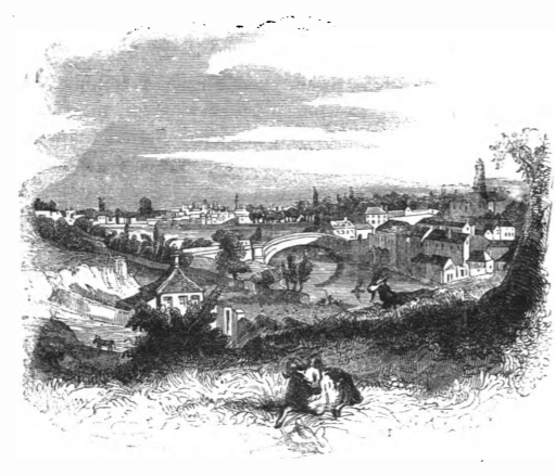 This image is a landscape overlooking a river in Dublin. The image is in a preface to the story, which provides a bibliography of the author, Jonathan Swift. A mouse is in the foreground, with a dog farther back. The scene is painted from the top of a hill, looking down towards several houses leading into a town, and a bridge crossing a river. The same image appears in the 1839 Krabbe edition.