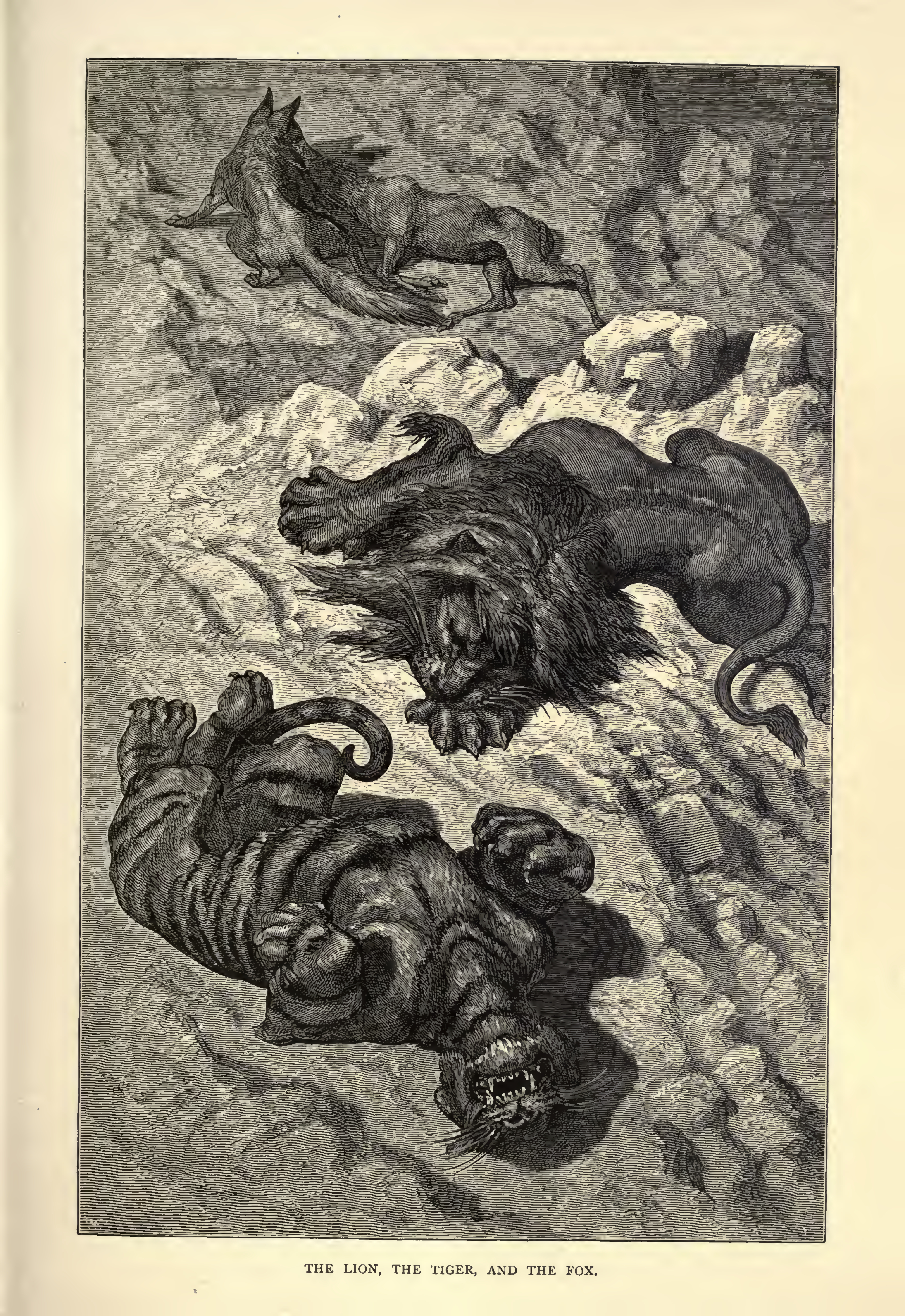 A tiger is lying on its back, showing its belly and baring its teeth. Next to the tiger, further right on the image, a lion is lying down its head towards the tiger. In the distance, two foxes are running away from the tiger and the lion.