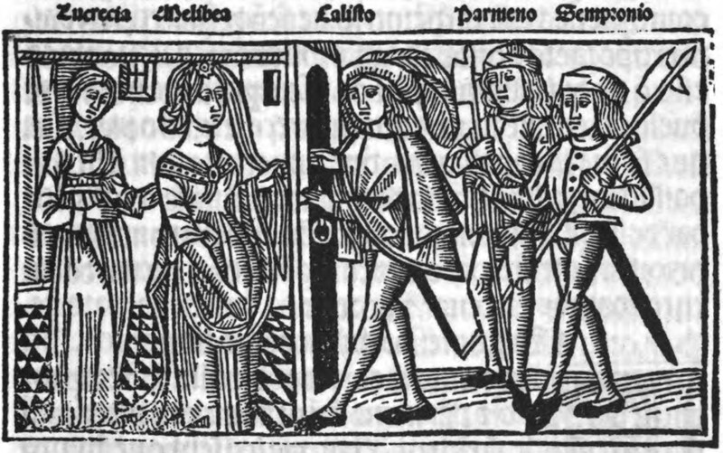 As Calisto and his servants arrive at Melibea's house, Calisto orders Pármeno to see whether Melibea is home. However, Pármeno suggests that it would be more appropriate if he was the one with whom Melibea first spoke. In this image, we see Melibea and Calisto standing on separate sides of the door talking to one another. Their hands are outstretched toward the same point on the door, giving the semblance that they are trying to connect regardless of a prohibitive barrier. Sempronio and Pármeno are at his side, armed to stand guard as Calisto and Melibea have their private encounter. Lucrecia stands behind Melibea, touching her back either as a sign of comfort or concern.Calisto does not see Melibea that night. She instead asks him to return to her house the following night, where she will be waiting in her garden.