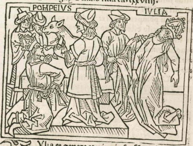 This engraving depicts two separate events. The left side of the engraving depicts Pompey the Great participating in a sacrifice of an animal. Pompey is depicted wearing a crown to signify his high status and nobility. The man to the right of Pompey is depicted cutting the neck of the animal that he is holding. There is blood splashing out from the animals wound, which stains Pompey’s clothing. Boccaccio explains that after Pompey’s garments became stained with the animal’s blood, a servant carried his stained clothes back home to get new ones. Julia, Pompey’s wife and the daughter of Julius Caesar, saw the blood-stained clothing of her husband and immediately thought that he had been murdered. Julia is depicted on the right side of the engraving after having just seen the clothing of her husband. She looks distraught and is depicted mid-fall to the ground. There is a servant beside her who is holding the blood-stained garments of her husband. Her name, written as Iulia, is engraved above her head to identify her. Similarly, Pompey’s name, written as Pompeius, is engraved above his head.