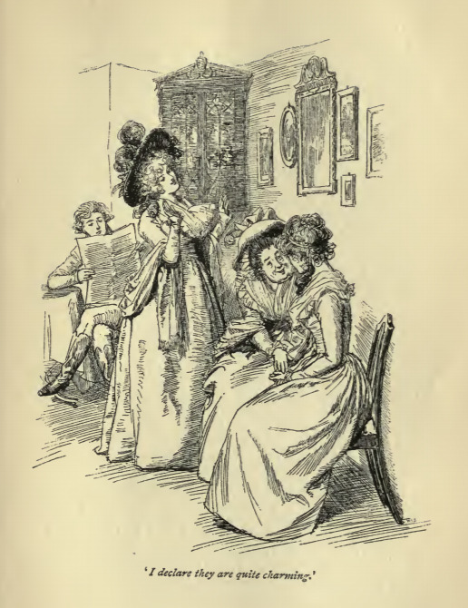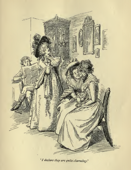 In this image Mrs. Jennings visits Barton Cottage with her daughter and son-in-law, Mr. And Mrs. Palmer. Elinor speaks with Mrs. Jennings and Mrs. Palmer, while Mr. Palmer sits in the corner, reading a newspaper. Elinor found Mr. Palmer to be cold and unfriendly, but Mrs. Palmer was warm and kind. This scene occurs in chapter 19. The characters are shown in the traditional regency style, as Mrs. Jennings, Mrs. Palmer, and Elinor wear the regency style dress with an empire waist. Mrs. Jennings and Mrs. Palmer wear bonnets. Mr. Palmer wears a waistcoat and tailcoat with breeches. The regency period dated to the early nineteenth century (1811-1820) when George, Prince of Wales, later George IV (r. 1820-1830), reigned as regent for his mentally ill father, King George III (r. 1760-1820). The regency period is associated with the rise of neoclassicism in art and fashion.