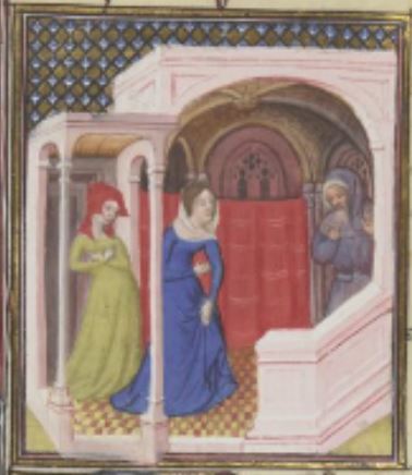 This illumination depicts Turia (also known as Curia), a Roman woman and wife of Quintus Lucretius, in the centre of the image wearing a blue dress as she hunches over. After her husband had gotten proscribed, Turia kept her husband safe within their house so that he would not have to go to war. She took care of him and went in public and pretended to have lost her husband so that no one would suspect that he was home. This image depicts Turia out in public pretending to be upset while looking for her 'lost' husband. There are other citizens in the image looking at Turia. Boccaccio explains that he wrote on Turia to highlight her devotion to her husband.