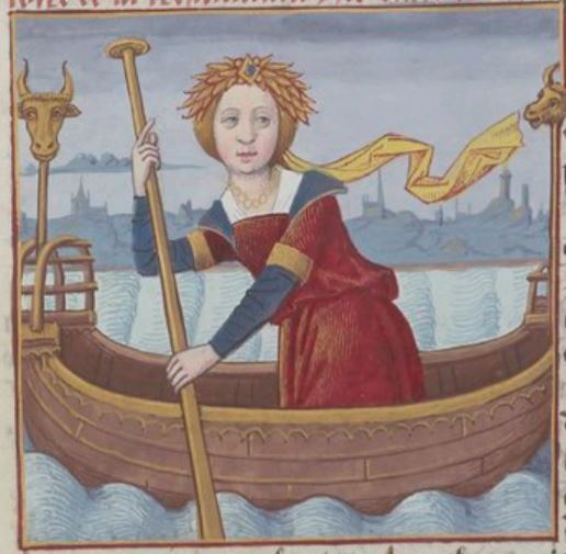 This illuminated image depicts Isis, previously called Io, holding an oar as she rows a ship. The ship has an emblem of a cow on the left side which symbolizes her transformation into a cow. She had been transformed into a cow by the god Jupiter, and after she was turned back into a human, she boarded a ship and sailed to Egypt. This image depicts her on her way to Egypt, where she eventually becomes queen and becomes deified.
