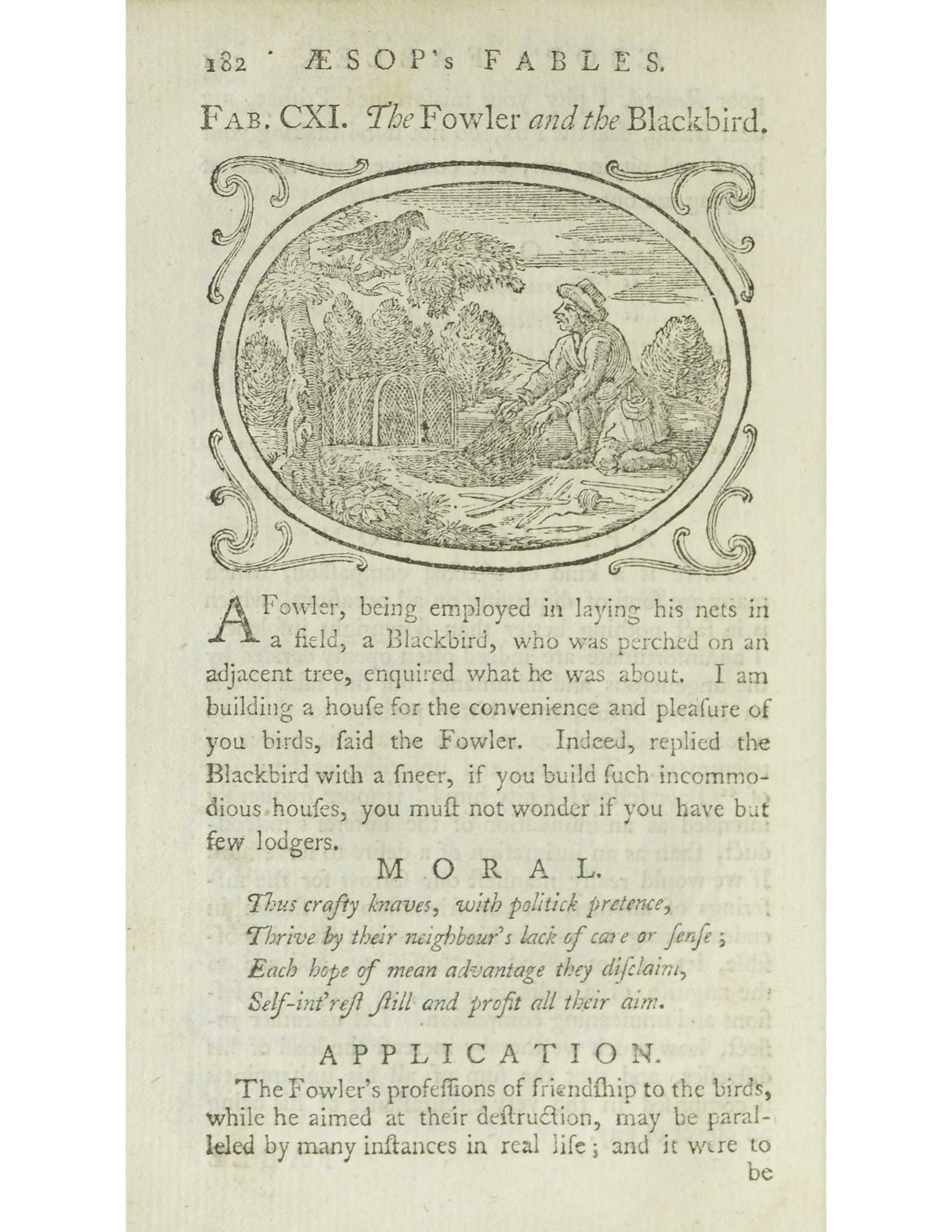 A wildfowl hunter sits on one knee while he lays a net on the ground. Next to the man is a tree with a Blackbird perched on a branch. Below the branch and next to the net is a cage with its door open. There are sticks and and a roll of twine on the ground next to the man. There are trees in the background.
