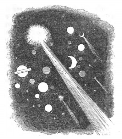 This image depicts some of the thirty-nine comets observed by the Laputans. They were also able to calculate their orbits with accuracy. The Laputan astronomers also wanted to present their theory of comets to the rest of the world. Here we see the planets and several comets that were observed by the Laputans. The same image appears in the 1839 Krabbe edition.