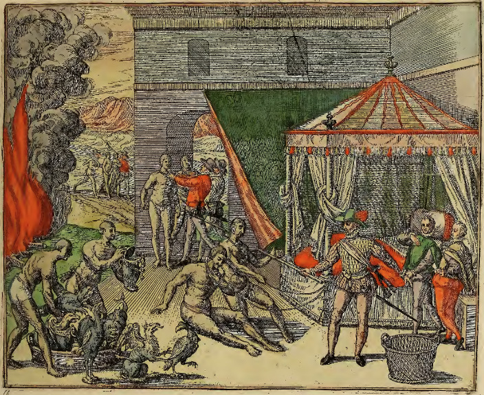 A group of Spaniards, one of whom is Diego Guttierez, governor of Costa Rica, takes at least four Indigenous leaders (Caciques) hostage and binds them in chains. Two of the Indigenous men have been bound by chains attached to the post of a large canopy bed inside the structure. Two others have been bound with chains around their necks, the ends of which are held by two Spanish men. On the left, two Indigenous men offer a basket full of exotic animals and vessels made of gold to the Spaniards. A large bonfire has been set on the left, and in the background two more Indigenous people walk towards the structure, escorted by two Spanish men. This image is identical to one found on page 147 of Frankfurt, 1595, but colored.