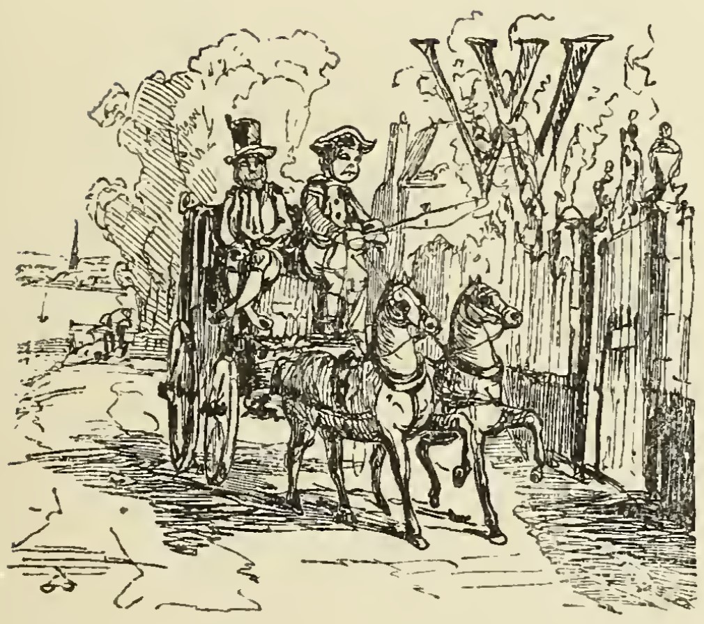 A coach drawn by two horses, driven by a coachman in a three-cornered hat. Beside him sits Sambo, the footman. On the right side of the image is the gate to Miss Pinkerton’s academy for young ladies, at which the coach has just arrived. In the background there are two trees and a building. In the top right of the image, overlapping with a tree, is the letter W from While.
