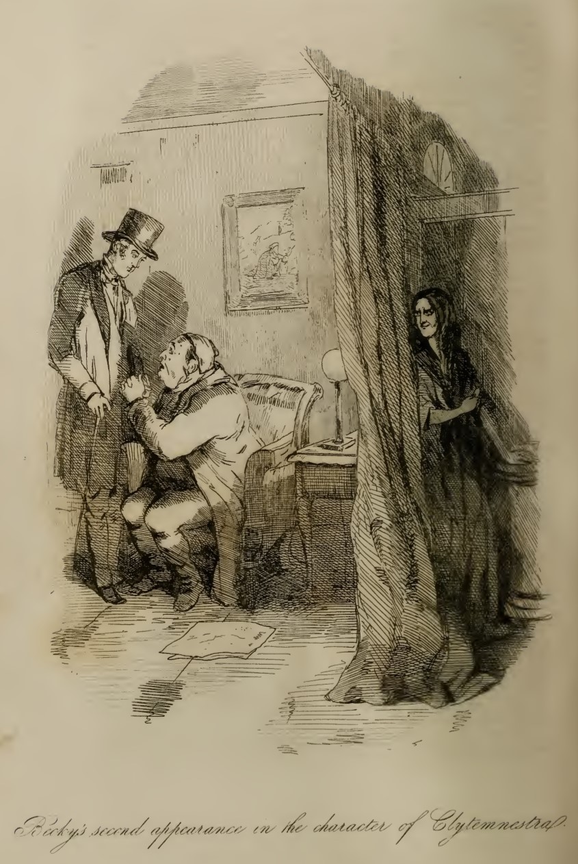 Joseph Sedley sits in a chair, begging William Dobbin, now his brother-in-law, to come and live near him, or else help him escape to India without Becky finding out. Behind a curtain on the far side of the room is Rebecca Crawley, listening in and holding a dagger in one hand. Below the illustration is printed in cursive its title, Becky’s second appearance in the character of Clytemnestra.