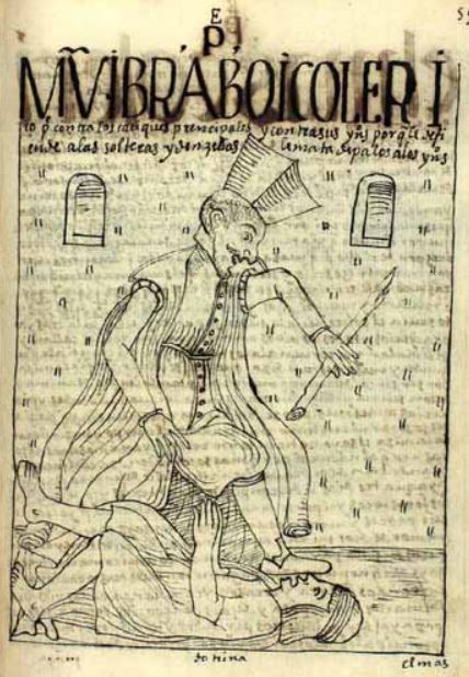 This image is illustrated in a chapter that discusses the Christian priests in the colonial government in Peru. This image depicts a Spanish parish priest standing over an indigenous man with his foot hovering over his face and a stick in his left hand. The priest is dressed in ecclesiastic adornments while the indigenous man is dressed in a simple tunic. The priest beats the indigenous man to death for having defended indigenous women from the priests. The author criticizes the priests for sexually harassing and abusing the unmarried indigenous women.