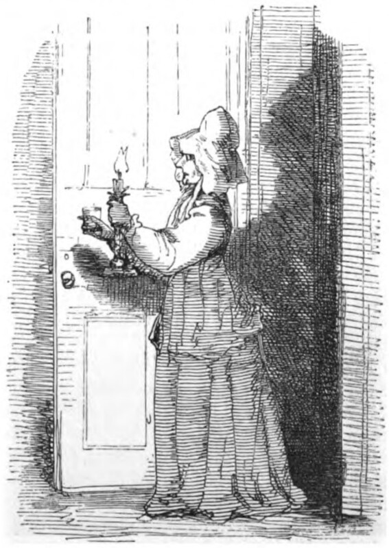 Lady Matilda Southdown, in her bed-gown and nightcap, carries a candlestick, a cup of medicine she has devised, and her favorite tracts through the doorway into Rebecca Crawley’s room.