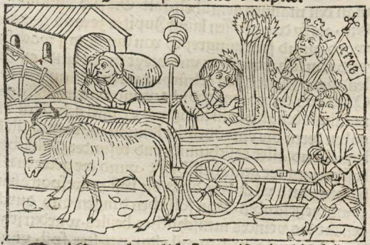 Ceres is depicted on the right-hand side of the engraving wearing a crown and holding a scepter. We know this is Ceres as her name is written beside her scepter. We also know this is Ceres as she is the goddess of harvest, which is what this engraving depicts. Boccaccio explains that after discovering agriculture, Ceres had tamed oxen and trained them to yoke. She also discovered planting seeds and then taught men how to harvest them once they matured. There is one man plowing the fields with the oxen, and another in the background husking grain. There is another man with a bag of flour over his head, as Ceres also taught men how to turn flour into an edible fare. Ceres wears the crown and scepter to signify her importance linked to agriculture and harvest.