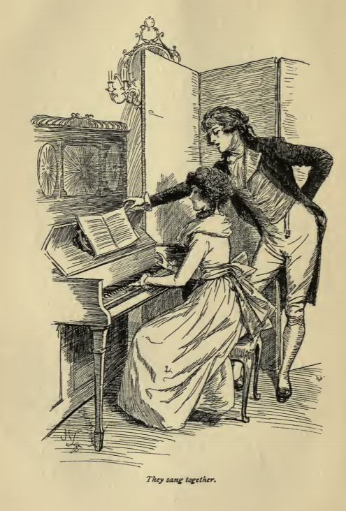 In this image Marianne and Willoughby sing together while Marianne plays piano. Young upper-class women were encouraged to practice some form of art, often either music or drawing. Elinor was a skilled artist while Marianne was a talented piano player. Willoughby and Marianne became close, and they often sang together. This scene occurs in chapter 10. The characters are shown in the traditional regency style, as Marianne wears the regency style dress with an empire waist. Willoughby wears a waistcoat and tailcoat with breeches and a cravat. The regency period dated to the early nineteenth century (1811-1820) when George, Prince of Wales, later George IV (r. 1820-1830), reigned as regent for his mentally ill father, King George III (r. 1760-1820). The regency period is associated with the rise of neoclassicism in art and fashion.