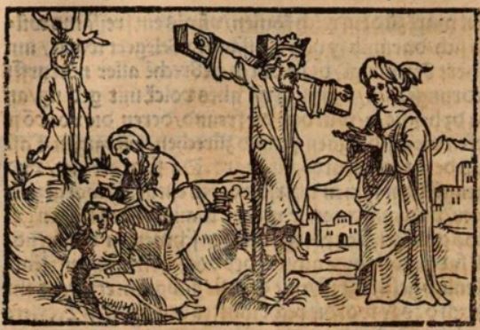 This engraving depicts Olympias of Macedonia on the right side of the engraving approaching a man hanging on a cross. The man being crucified is Pausanias, a man who helped Olympias with the murder of King Philip of Macedonia (husband to Olympias). Boccaccio explains that Olympias placed the golden crown that Pausanias is wearing on his head to honour him and reward him for the assassination. Along with getting her husband murdered, she also had her husband’s new wife and child murdered out of anger. Cleopatra, King Philip’s other wife, is pictured on the left side of the engraving hanging by her neck from a tree. Cleopatra’s child is depicted sitting on the ground as one of Olympias’ servants is bashing her head with a rock.