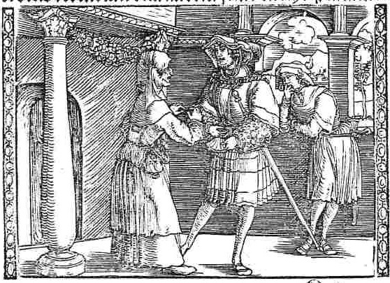 The decision to include Celestina in this illustration is odd, seeing as neither she (nor any other female character) is included in the second act. However, the illustration likely represents the end of the first act, in which Calisto gives her 100 gold crowns (likely referring to the form of currency known as 'crown' or 'Krone') as pre-payment for her services. We see that Calisto (central figure) is holding a small bag, and Celestina (leftmost figure) has something in her hands. Behind Calisto, we see another male figure (either Sempronio or Pármeno), who appears to be yawning.
