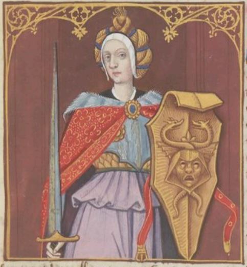 This illuminated image depicts Minerva (also known as Pallas), the goddess of wisdom and war. She is illustrated holding a sword in her right hand and a shield in her left. The shield that she is holding has a depiction of Medusa on the front. Minerva is also renown for having created weaving and wool work, however this image focusses specifically on her being the goddess of war.