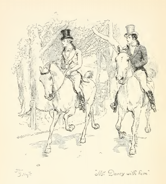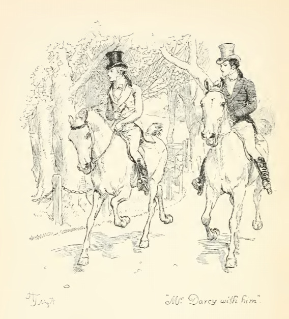In this image Mr. Darcy and Mr. Bingley arrive at Longbourn. After Lydia’s wedding, Mr. Bingley returned to Netherfield, with Mr. Darcy. Shortly after their return the two men came to Longbourn. Mrs. Bennet greets Mr. Bingley warmly but does not extend the same courtesy to Mr. Darcy, mortifying Elizabeth. This scene occurs in chapter 53. The characters are shown in the traditional regency style. Mr. Darcy and Mr. Bingley ride on horseback, and wear waistcoats and tailcoats with top hats. The regency period dated to the early nineteenth century (1811-1820) when George, Prince of Wales, later George IV (r. 1820-1830), reigned as regent for his mentally ill father, King George III (r. 1760-1820). The regency period is associated with the rise of neoclassicism in art and fashion.