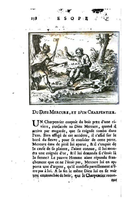 A carpenter cuts wood by a river, his axe fell from his hands into the water. The god Mercury appeared and asked what the trouble was. The carpenter told what had happened, and Mercury dived into the water. When he came up he held a golden axe. The carpenter was honest about the golden axe not being his. Mercury laid the golden axe on the bank and sprang back into the pool, this time he brought up an axe of silver. The carpenter again was honest about it not being his axe. Mercury dived down for a third time, coming up with the lost axe. The carpenter was very thankful for Mercury's help. Mercury was pleased with the carpenters honesty and rewarded him with all three axes.