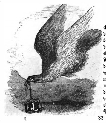 Here we see the eagle that carried Gulliver in his house away from Brobdingnag. The eagle picked up Gulliver’s house and carried it out over the ocean before dropping it. Gulliver was then rescued by a merchant’s ship. The image appears at the beginning of the eighth chapter, foreshadowing Gulliver’s escape from Brobdingnag. The same image appears in the 1839 Krabbe edition.