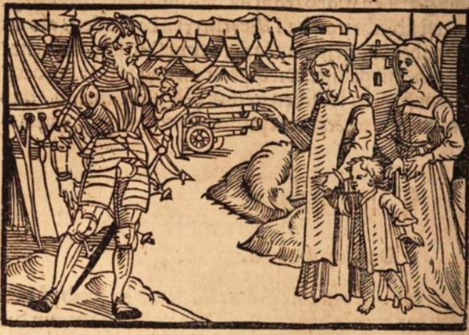 A noble Roman woman named Veturia is depicted on the right side of the engraving with her daughter-in law and grandchild beside her. She is illustrated pointing at the man on the left side of the engraving. This man is her son, Coriolanus. They are depicted standing in the middle of a war camp site, with tents and cannons surrounding them. Boccaccio explains that after Coriolanus had been exiled from Rome for neglecting the plebian class, he planned an attack on Rome. Veturia, with the help of her daughter-in-law (Volumnia) and grandchild, went to speak with Coriolanus at his camp and convinced him to not go through with the attack. Boccaccio explains that he decided to write on Veturia for her honour as a mother and a woman.