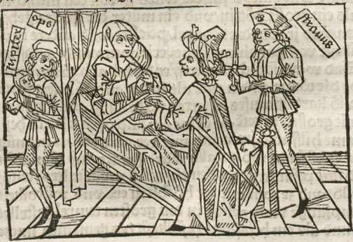 Ops, wife of the god Saturn, is depicted laying in a bed after just having given birth to her children: Jupiter, Neptune and Pluto. We know the woman lying in the bed is Ops as her name is engraved beside the curtains of the bed. Baby Jupiter is illustrated being carried away by a servant with his name engraved beside the person carrying him. Boccaccio’s story explains that Saturn and Ops’ brother, Titan, planned to kill the children to avoid them growing up and defeating them. Saturn is illustrated with his hands outstretched towards baby Jupiter. Titan is on the opposite side of Ops’ bed with a sword in his hand. His name is written as Titanus beside his head.