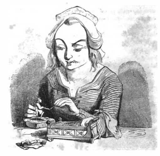 In this image we see Gulliver and Glumdalclitch – the daughter of the farmer, who became Gulliver’s nurse. Gulliver kneels on a cushion, and hands Glumdalclitch his sword. A small sleigh bed that Glumdalclitch made for Gulliver is in the foreground, with Gulliver’s clothes lying on the ground. Glumdalclitch wears a dress with laces in the front, and a cap with her hair coming out from the bottom. The same image appears in the 1843 Krabbe edition.