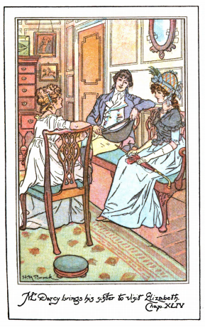 Here we see Mr. Darcy introducing Elizabeth to his sister, Georgiana. Elizabeth went on vacation to the north of England with her aunt and uncle, and visited Mr. Darcy's estate, Pemberley. He arrived at Pemberley unexpectedly, and he met Elizabeth while she was touring the gardens. He then offered to introduce Elizabeth to his sister, Georgiana, shown here. Elizabeth and Darcy sit on a couch, and Georgiana sits sideways on a chair opposite Elizabeth. Elizabeth wears her bonnet and holds her parasol. She also wears white gloves. Georgiana is dressed less formally. This scene occurs in chapter 46 as noted underneath the title of this image. The characters are shown in the traditional regency style, with Mr. Darcy wearing waistcoat, tailcoat, and knickers that stopped at the knee. Elizabeth and Georgiana wear the regency style dress with an empire waist. Their hair is worn tied up, as was tradition for women after their coming out before the queen, signaling her entrance into society. Elizabeth wears a bonnet, a popular fashion of this period to protect her from the sun. Bonnets were especially popular because in this period a common pastime for women was going out on walks. The regency period dated to the early nineteenth century (1811-1820) when George, Prince of Wales, later George IV (r. 1820-1830), reigned as regent for his mentally ill father, King George III (r. 1760-1820). The regency period is associated with the rise of neoclassicism in art and fashion.