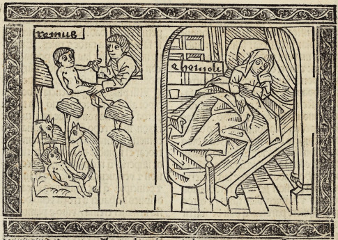 The vestal virgin Rhea Ilia is depicted on the right side of the engraving, lying in a bed with her eyes shut. We know that this is Rhea as her name is engraved beside her body. She has a saddened expression on her face as she had just given birth to twin boys named Remus and Romulus who were forced to be exposed. Boccaccio explains that as a vestal virgin, she was forbidden from becoming pregnant. Her son’s Remus and Romulus are depicted on the left side of the engraving being exposed through the window. Remus's name is engraved at the top left-hand corner of the image. There are wolves surrounding Romulus as the mother wolf ends up raising the boys as her own. Rhea is buried alive for her punishment.