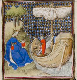 Perseus, wearing a red cloak, is seen seated on the winged horse Pegasus, inside of a boat that brings him to land. Pegasus represents both the emblem of the ship that Perseus rode, but also the mythical tale in which Perseus rode Pegasus the winged horse to fly to Medusa’s kingdom. Perseus was seeking Medusa because he heard of her beauty that was known to render men motionless. Medusa, wearing a blue gown and crown, is seated on the bank of the shore.