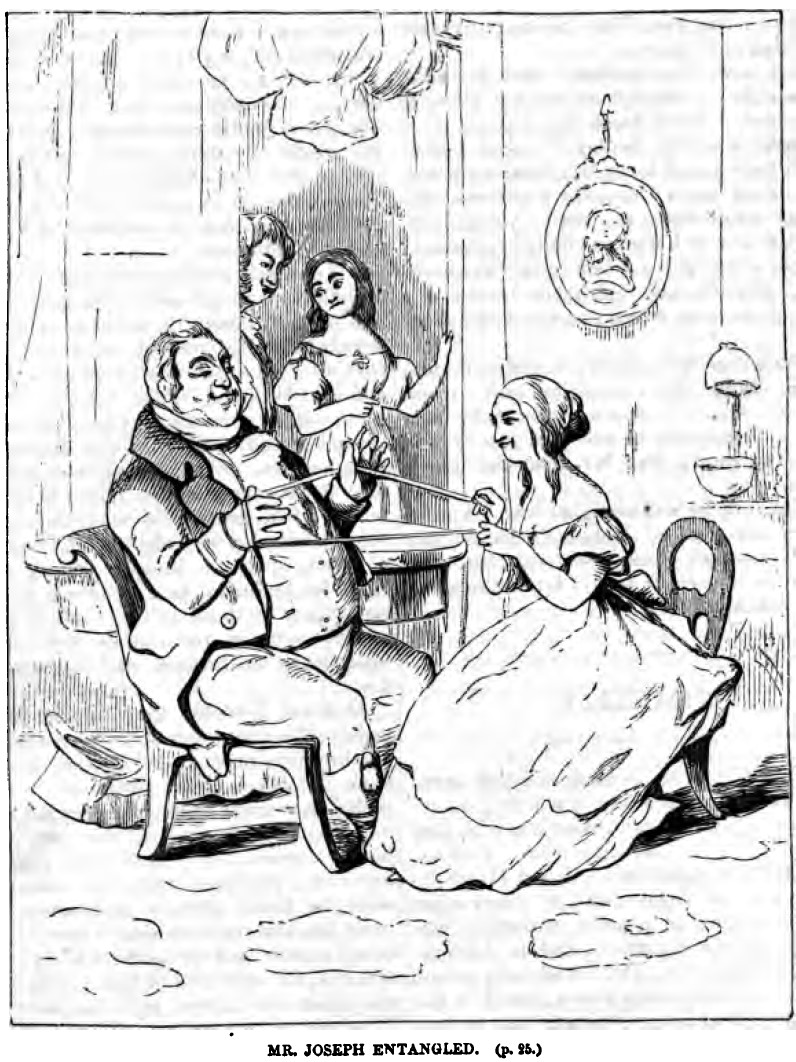Joseph Sedley and Rebecca Sharp sit at two chairs in front of a round table; she holds both ends of a string of silk which is wound around his hands. Beneath the table is Joseph’s hat, and in the background are another table with a lamp and bowl and a portrait upon the wall. Amelia Sedley and George Osborne are entering through the doorway behind the round table at which the others sit. All four look pleased. Below the illustration is printed its title and location in the story, MR. JOSEPH ENTANGLED. (p. 25.).
