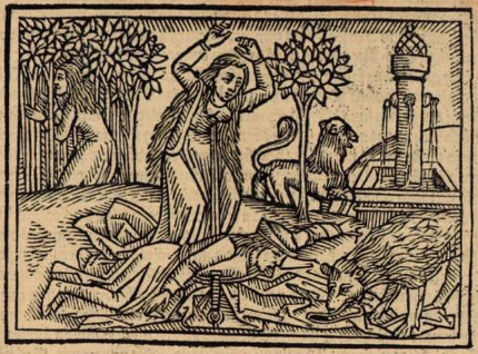 This engraving depicts Thisbe, a young virgin from Babylon killing herself after finding her lover Pyramus already dead. Boccaccio explains that the two lovers were forbidden from being together, so they devised a plan to run away. Thisbe waited for Pyramus by a fountain (depicted on the right side of the engraving) when a lioness suddenly appeared. Thisbe ran into the woods, as depicted in the background on the left side of the image. The lioness, with a blood-stained mouth, chewed on the cloak that Thisbe left behind after running. This is illustrated in the foreground of the engraving. Pyramus had then arrived at the meeting point, only to find the bloody cloak of Thisbe. Believing her to be dead, Pyramus killed himself with his sword. Pyramus is depicted lying on the ground with his sword impaled through his chest. Thisbe found Pyramus as he was dying and impaled herself with the same sword in order to be with her lover.