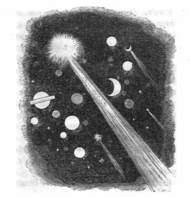 This image depicts some of the thirty-nine comets observed by the Laputans. They were also able to calculate their orbits with accuracy. The Laputan astronomers also wanted to present their theory of comets to the rest of the world. Here we see the planets and several comets that were observed by the Laputans. The same image appears in the 1843 Krabbe edition.