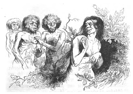 Gulliver’s master explained various aspects of the Yahoos that lived in the Country of the Houyhnhnms. He told Gulliver that female yahoos would sometimes stand behind a bush to watch the males, who would later approach her. The same image appears in the 1839 Krabbe edition.