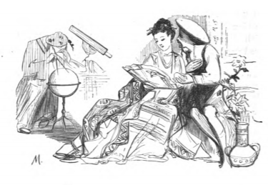 Gulliver tells us that the Laputan scholars were so wrapped up in their work that they are not aware of what is going on around them. This means that their wives would have affairs right under their noses. In this image we see a Laputan woman flirting with a man, while her husband sits in the background working, not noticing his wife.