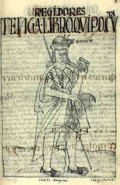 This image depicts a native official in Spanish colonial Peru. The man is a regidores [councillor] for a local village who would do accounting work. He is depicted holding a book in his left hand and a quipu in his right. Quipu’s were recording devices in the Inca Empire in which knots where tied along ropes to communicate numbers. The official is also depicted carrying a long staff in his right arm and wearing traditional clothing that has embroidery on the tunic. The caption at the bottom of the image reads, en este rreyno [in this kingdom].