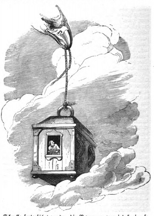 Here we see the eagle carrying away Gulliver’s house from Brobdingnag. In the image we see the eagle’s head with a rope attached to Gulliver’s head in his beak. Gulliver leans out the window, looking up at the eagle. We see the straps attached to Gulliver’s house which were worn like a backpack when he was travelling. This is the smaller of his two houses, as this was designed for travel. The same image appears in both the 1839 and 1843 Krabbe editions.