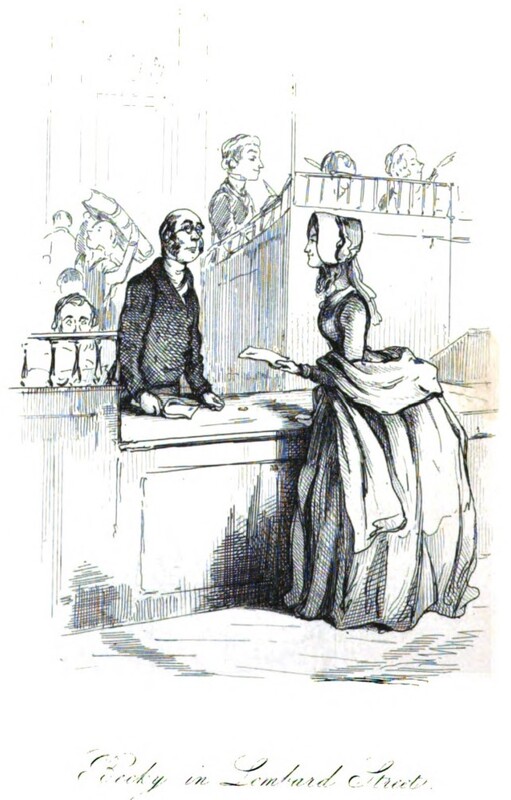 Rebecca Crawley stands at the desk of Messrs. Jones and Robinson’s bank. She is holding out a document which Lord Steyne sent to her, entitling her to a large sum of money from his account. On the other side of the desk is a bank official, holding a coin shovel. In the background are other employees of the bank, seated and standing, carrying quills and books. Below the illustration is printed in cursive its title, Becky in Lombard-Street.