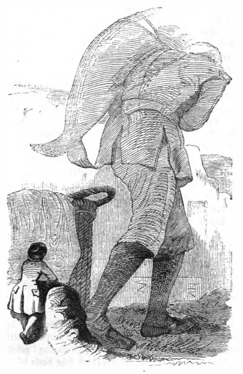In this image we see Gulliver watching a giant from Brobdingnag carrying a large fish over his shoulder. The image comes when Gulliver describes the countryside in Brobdingnag. Gulliver leans on a rock, relaxing. The giant is hunched over with a large fish thrown over its shoulder. We see the backs of Gulliver and the giant. Next to Gulliver is a large basket. The same image appears in the 1839 Krabbe edition.