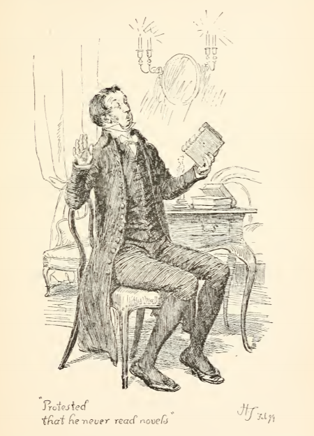 In this image Mr. Collins refuses to read a novel. Mr. Collins’ was Mr. Bennet’s heir, and came to visit Longbourn. While visiting, Mr. Bennet suggested he read out loud to the ladies and offers him a novel. Mr. Collins responds in disgust that he never reads novels, choosing instead a book of sermons. This scene occurs in chapter 14. The characters are shown in the traditional regency style. Mr. Collins wears a waistcoat and tailcoat and holds a book of sermons. The regency period dated to the early nineteenth century (1811-1820) when George, Prince of Wales, later George IV (r. 1820-1830), reigned as regent for his mentally ill father, King George III (r. 1760-1820). The regency period is associated with the rise of neoclassicism in art and fashion.